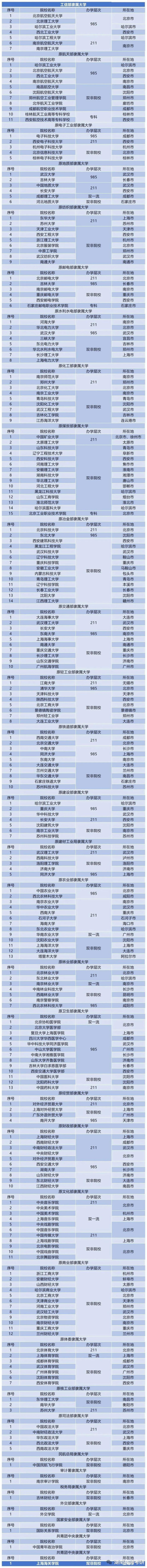 这些院校,曾经都是隶属于某一行业部门其下,涉及有工信部、原航天部、原电子工业部、原地质部等25个行业。有985,也有211,甚至还有不少专科院校。所以,一定要查查院校的历史~别被简单的名字和学校所在地址忽悠掉。